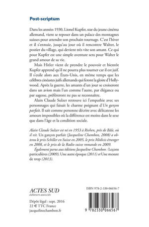 Dans les années 1930, Lionel Kupfer, star du jeune cinéma allemand, vient se reposer dans un palace des montagnes suisses pour attendre son prochain tournage. C'est l'hiver et il s'ennuie, jusqu'au jour où il rencontre Walter, le postier du village, qui devient très vite son amant. Ce qui pour Kupfer est une simple aventure sera pour Walter le grand amour de sa vie. Mais Hitler vient de prendre le pouvoir et bientôt Kupfer apprend qu'il ne pourra plus tourner car il est juif. Il s'exile alors aux États-Unis, en même temps que les célèbres cinéastes juifs allemands qui feront la gloire d'Hollywood. Après la guerre, les amants d'un jour se croiseront dans un avion mais l'un comme l'autre, par élégance ou par sagesse, préféreront ne pas se reconnaître. Alain Claude Sulzer retrouve ici l'empathie avec ses personnages qui faisait le charme poignant d'«Un garçon parfait». Il sait comme personne décrire avec délicatesse les amours impossibles où la différence est moins dans le sexe que dans l'âge et la condition sociale.