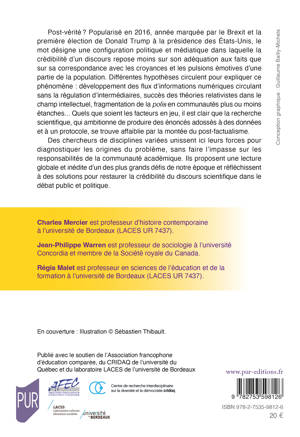 Post-vérité ? Popularisé en 2016, année marquée par le Brexit et la première élection de Donald Trump à la présidence des États-Unis, le mot désigne une configuration politique et médiatique dans laquelle la crédibilité d’un discours repose moins sur son adéquation aux faits que sur sa correspondance avec les croyances et les pulsions émotives d’une partie de la population. Différentes hypothèses circulent pour expliquer ce phénomène : développement des flux d’informations numériques circulant sans la régulation d’intermédiaires, succès des théories relativistes dans le champ intellectuel, fragmentation de la polis en communautés plus ou moins étanches... Quels que soient les facteurs en jeu, il est clair que la recherche scientifique, qui ambitionne de produire des énoncés adossés à des données et à un protocole, se trouve affaiblie par la montée du post factualisme. Des chercheurs de disciplines variées unissent ici leurs forces pour diagnostiquer les origines du problème, sans faire l’impasse sur les responsabilités de la communauté académique. Ils proposent une lecture globale et inédite d’un des plus grands défis de notre époque et réfléchissent à des solutions pour restaurer la crédibilité du discours scientifique dans le débat public et politique.