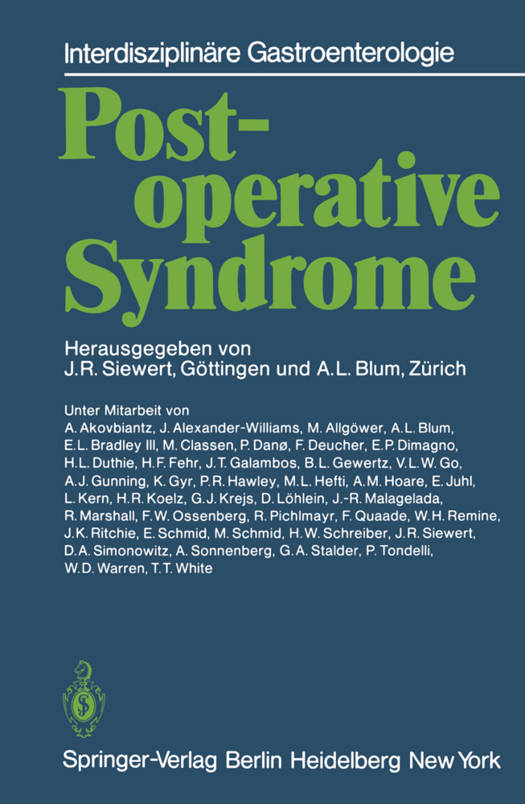 Postoperative Syndrome sind ein besonders geeignetes Thema flir die interdisziplinare Gastroenterologie. Internist und Chirurg teilen sich in die Verantwortung flir die Entstehung derartiger Syndrome und die Crux ihrer Behandlung. Auch die Diagnostik ist eine gemeinsame Auf gabe, sowohl im Fa11e eines einzelnen Patienten mit Beschwerden als auch im Rahmen von Erfolgsbeurteilungen chirurgischer Eingriffe. Die postoperativen Syndrome haben bislang in der Literatur ein Schatten dasein geflihrt. Die wesentliche Ursache mag darin liegen, daB a11e Folge krankheiten nach chirurgischen Eingriffen zu leicht dem Chirurgen ange1astet worden sind. Viele postoperative Syndrome sind jedoch un vermeidliche, dem chirurgischen Eingriff zwangsIa ufig anhaftende F olgen. Mit diesem Buch solI eine objektive Wertung erfolgen. Das groBte Anliegen der Herausgeber besteht darin, geniigend Fakten flir eine sach bezogene Diskussion zu liefern und emotionellen Auseinandersetzungen den Boden zu entziehen. Die "Postsurgical Syndromes" erschienen 1979 .in den "Clinics in Gastroenterology" und wurden anIa13lich der deutschen Ubersetzung iiberarbeitet und erganzt. Der Dank der Herausgeber gilt Herrn Dr. F. Baumgartel flir die Mithilfe bei der Ubersetzung und dem Springer Verlag flir Hilfe und Entgegenkommen. Zurich J. R. SIEWERT A. L. BLUM Gottingen Friihjahr 1980 Inhaltsverzeichnis Kapitell Einleitung: Was ist ein postoperatives Syndrom? J. R. SIEWERT und A. L. BLUM. . . . . . . . . . . . . . . . . . .. . . 1 . ."