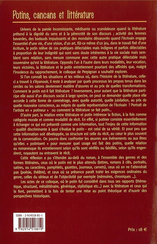 Ce colloque qui s'est tenu à Perpignan en novembre 2004 s'interroge sur les liens éventuels entre potin et littérature. Opposés l'un à l'autre dans leurs modalités et leur vocation, ceux-ci entretiennent pourtant des affinités qui sont ici explorées.