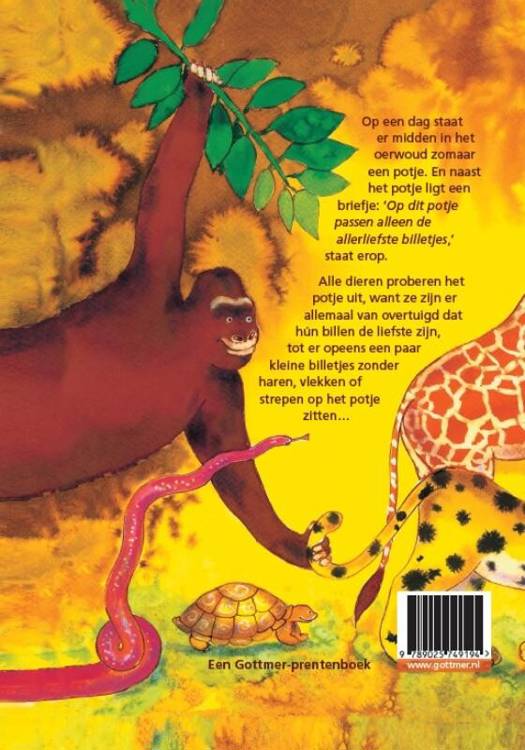 'Potje!' van Mylo Freeman is een heerlijk prentenboek over zindelijkheid en op het potje gaan. Voor kinderen vanaf 2 jaar. Op een dag staat er midden in het oerwoud zomaar een potje. En naast het potje ligt een briefje: 'Op dit potje passen alleen de allerliefste billetjes.' Alle dieren proberen het potje uit, maar de billen van de olifant zijn te groot, de slang heeft helemaal geen billen en de aap weet niet eens wat hij met een potje moet doen. Terwijl de dieren kibbelen, komt er opeens een jongetje tevoorschijn - en dan beseffen ze voor wie het potje is bedoeld. Dit keer zijn alle dieren het hartgrondig met elkaar eens: dit schattige jongetje heeft echt de liefste billetjes!