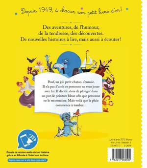 Pouf est un petit chaton bien triste : il n'a aucun ami ! Et pour cause, il refuse de partager ses affaires, et fait preuve d'un peu d'égoïsme. Alors, il trouve une parade : en plongeant dans un pot de peinture, son pelage devient tout bleu ! Le voilà qui devient un autre petit chaton, tout mignon ! Le joli Rouge-Gorge et la petite souris Grignotte n'y voient que du feu. Jusqu'à ce que la pluie lui rende son pelage blanc...