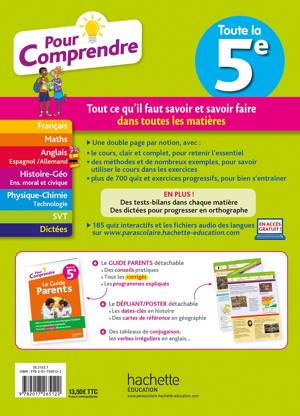 Le GUIDE PARENTS détachable • Les programmes expliqués • Des conseils pratiques • Tous les corrigés Le DÉPLIANT/POSTER détachable • Les dates-clés en histoire • Des cartes de référence en géographie Des tableaux de conjugaison, les verbes irréguliers en anglais...