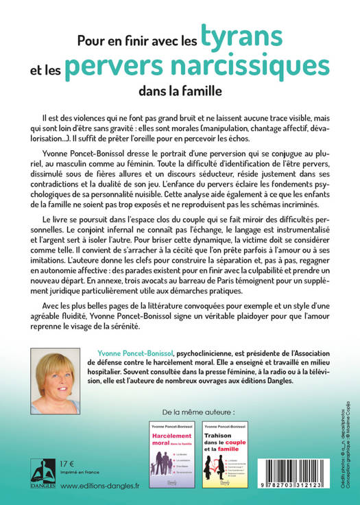 Il est des violences qui ne font pas grand bruit et ne laissent aucune trace visible, mais qui sont loin d’être sans gravité : elles sont morales (manipulation, chantage affectif, dévalorisation…). Il suffit de prêter l’oreille pour en percevoir les échos. Yvonne Poncet-Bonissol dresse le portrait d’une perversion qui se conjugue au pluriel, au masculin comme au féminin. Toute la difficulté d’identification de l’être pervers, dissimulé sous de fières allures et un discours séducteur, réside justement dans ses contradictions et la dualité de son jeu. L’enfance du pervers éclaire les fondements psychologiques de sa personnalité nuisible. Cette analyse aide également à ce que les enfants de la famille ne soient pas trop exposés et ne reproduisent pas les schémas incriminés. Le livre se poursuit dans l’espace clos du couple qui se fait miroir des difficultés personnelles. Le conjoint infernal ne connaît pas l’échange, le langage est instrumentalisé et l’argent sert à isoler l’autre. Pour briser cette dynamique, la victime doit se considérer comme telle. Il convient de s’arracher à la cécité que l’on prête parfois à l’amour ou à ses imitations. L’auteure donne les clefs pour construire la séparation et, pas à pas, regagner en autonomie affective : des parades existent pour en finir avec la culpabilité et prendre un nouveau départ. En annexe, trois avocats au barreau de Paris témoignent pour un supplément juridique particulièrement utile aux démarches pratiques.