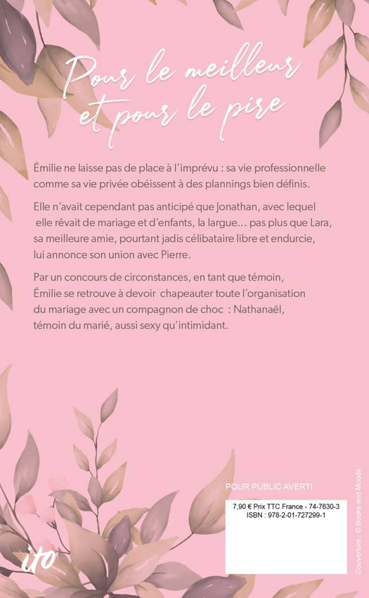 Émilie ne laisse pas de place à l'imprévu : sa vie professionnelle comme sa vie privée obéissent à des plannings bien définis. Elle n’avait cependant pas anticipé que Jonathan, avec lequel elle rêvait de mariage et d’enfants, la largue... pas plus que Lara, sa meilleure amie, pourtant jadis célibataire libre et endurcie, lui annonce son union avec Pierre. Par un concours de circonstances, en tant que témoin, Émilie se retrouve à devoir chapeauter toute l’organisation du mariage avec un compagnon de choc : Nathanaël, témoin du marié, aussi sexy qu’intimidant. Émilie cédera-t-elle à son charme et réussira-t-elle (enfin) à se laisser aller ?