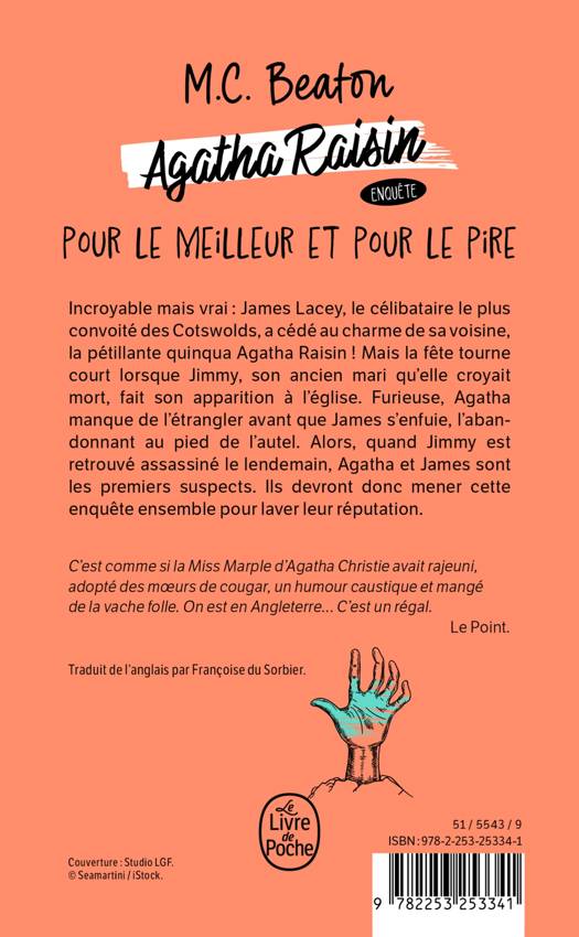 Incroyable mais vrai : James Lacey, le célibataire le plus convoité des Cotswolds, a cédé au charme de sa voisine, la pétillante quinqua Agatha Raisin ! Mais la fête tourne court lorsque Jimmy, son ancien mari qu’elle croyait mort, fait son apparition à l’église. Furieuse, Agatha manque de l’étrangler quand James s’enfuit, l’abandonnant au pied de l’autel. Alors, quand Jimmy est retrouvé assassiné le lendemain, Agatha et James sont les premiers suspects. Ils devront donc mener cette enquête ensemble pour laver leur réputation.