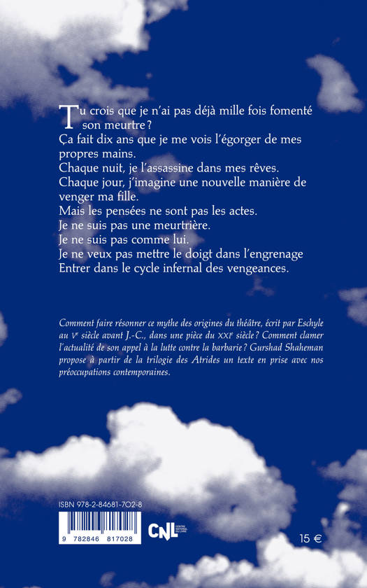 Comment faire résonner ce mythe des origines du théâtre, écrit par Eschyle au ve siècle avant J.-C., dans une pièce du xxie siècle ? Comment clamer l’actualité de son appel à la lutte contre la barbarie ? C’est à la demande de Catherine Marnas, et Nuno Cardoso, directeur du Théâtre national de Porto, que Gurshad Shaheman propose, à partir de la trilogie des Atrides, un nouveau texte qui « parle aux gens de notre temps. »