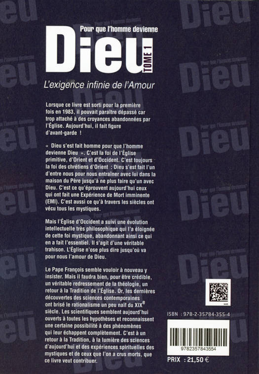 Lorsque ce livre est sorti pour la première fois en 1983, il pouvait paraître dépassé car trop attaché à des croyances abandonnées par l'Église. Aujourd'hui, il fait figure d'avant-garde ! « Dieu s'est fait homme pour que l'homme devienne Dieu ». C'est la foi de l'Église primitive, d'Orient et d'Occident. C'est toujours la foi des chrétiens d'Orient : Dieu s'est fait l'un d'entre nous pour nous entraîner avec lui dans la maison du Père jusqu'à ne plus faire qu'un avec Dieu. C'est ce qu'éprouvent aujourd'hui ceux qui ont fait une expérience de mort imminente (EMI). C'est aussi ce qu'à travers les siècles ont vécu tous les mystiques. Mais l'Église d'Occident a suivi une évolution intellectuelle très philosophique qui l'a éloignée de cette foi mystique, abandonnant ainsi ce qui en a fait l'essentiel. Il s'agit d'une véritable trahison. L'Église n'ose plus dire jusqu'où va pour nous l'amour de Dieu. Le Pape François semble vouloir à nouveau y insister. Mais il faudra bien, pour être crédible, un véritable redressement de la théologie, un retour à la Tradition de l'Église. Or, les dernières découvertes des sciences contemporaines ont brisé le rationalisme un peu naïf du XIXe siècle. Les scientifiques semblent aujourd'hui ouverts à toutes les hypothèses et reconnaissent une certaine possibilité à des phénomènes qui leur échappent complètement. C'est à un retour à la Tradition, à la lumière des sciences d'aujourd'hui et des expériences spirituelles des mystiques et de ceux que l'on a crus morts, que ce livre veut contribuer.