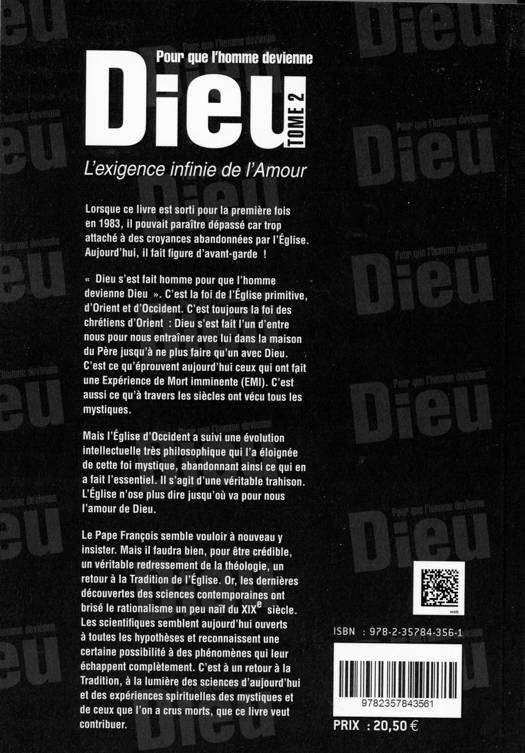 Lorsque ce livre est sorti pour la première fois en 1983, il pouvait paraître dépassé car trop attaché à des croyances abandonnées par l'Église. Aujourd'hui, il fait figure d'avant-garde ! « Dieu s'est fait homme pour que l'homme devienne Dieu ». C'est la foi de l'Église primitive, d'Orient et d'Occident. C'est toujours la foi des chrétiens d'Orient : Dieu s'est fait l'un d'entre nous pour nous entraîner avec lui dans la maison du Père jusqu'à ne plus faire qu'un avec Dieu. C'est ce qu'éprouvent aujourd'hui ceux qui ont fait une expérience de mort imminente (EMI). C'est aussi ce qu'à travers les siècles ont vécu tous les mystiques. Mais l'Église d'Occident a suivi une évolution intellectuelle très philosophique qui l'a éloignée de cette foi mystique, abandonnant ainsi ce qui en a fait l'essentiel. Il s'agit d'une véritable trahison. L'Église n'ose plus dire jusqu'où va pour nous l'amour de Dieu. Le Pape François semble vouloir à nouveau y insister. Mais il faudra bien, pour être crédible, un véritable redressement de la théologie, un retour à la Tradition de l'Église. Or, les dernières découvertes des sciences contemporaines ont brisé le rationalisme un peu naïf du XIXe siècle. Les scientifiques semblent aujourd'hui ouverts à toutes les hypothèses et reconnaissent une certaine possibilité à des phénomènes qui leur échappent complètement. C'est à un retour à la Tradition, à la lumière des sciences d'aujourd'hui et des expériences spirituelles des mystiques et de ceux que l'on a crus morts, que ce livre veut contribuer.