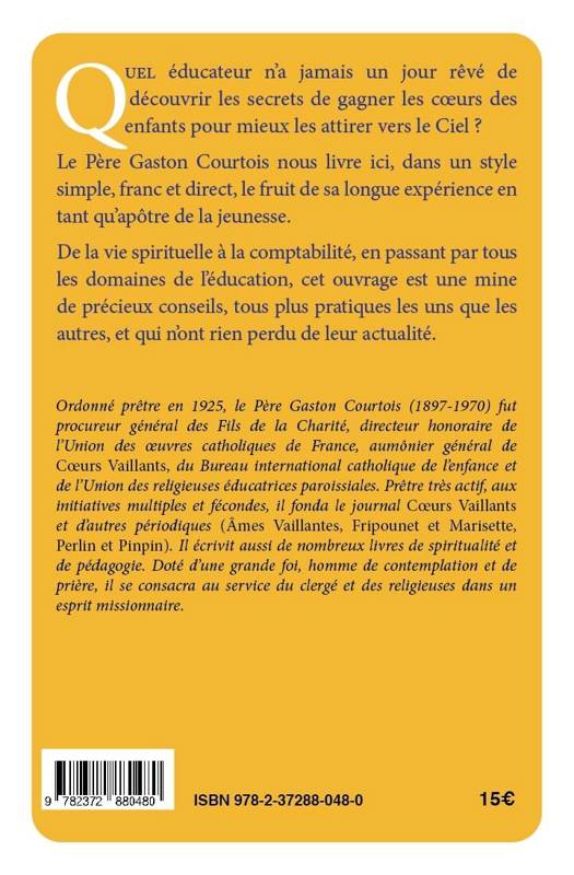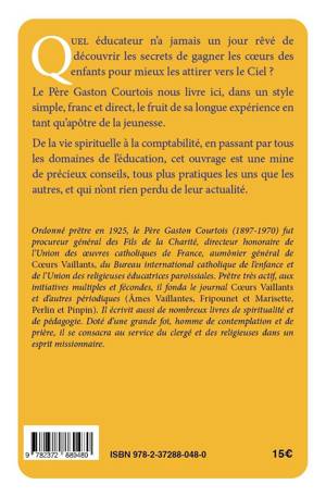 Quel éducateur n’a jamais un jour rêvé de découvrir les secrets de gagner les cœurs des enfants pour mieux les attirer vers le Ciel ? Le Père Gaston Courtois nous livre ici, dans un style simple, franc et direct, le fruit de sa longue expérience en tant qu’apôtre de la jeunesse. De la vie spirituelle à la comptabilité, en passant par tous les domaines de l’éducation, cet ouvrage est une mine de précieux conseils, tous plus pratiques les uns que les autres, et qui n’ont rien perdu de leur actualité.
