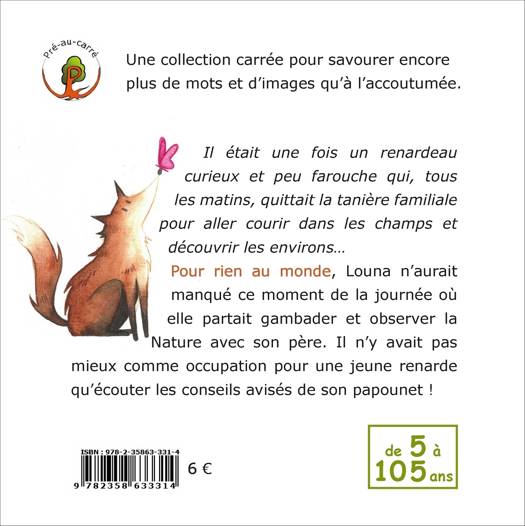 Dans la collection Pré-au-carré : une collection carrée pour savourer encore plus de mots et d’images qu’à l’accoutumée. - Il était une fois un renardeau curieux et peu farouche qui, tous les matins, quittait la tanière familiale pour aller courir dans les champs et découvrir les environs… Pour rien au monde, Louna n’aurait manqué ce moment de la journée où elle partait gambader et observer la Nature avec son père. Il n’y avait pas mieux comme occupation pour une jeune renarde qu’écouter les conseils avisés de son papounet ! - Les renards sont mal aimés partout en France, et trop rares sont les humains qui leur viennent en aide, comme le fait Gaston, un des trois héros de cette histoire. Pour rien au monde est un bel album à offrir à tous les amoureux de la Nature et à ceux qui pensent que les humains gagneraient à vivre en bonne intelligence avec la faune sauvage… De 5 à 105 ans