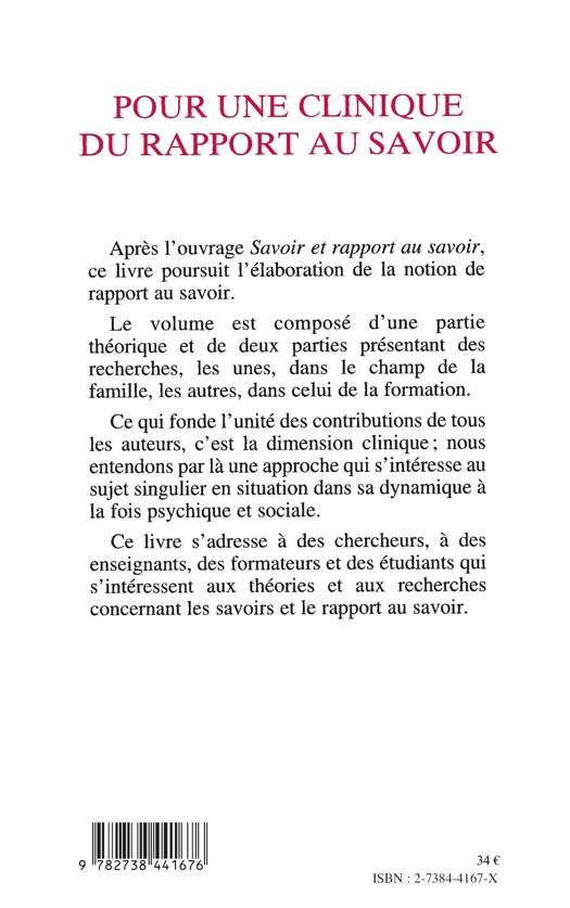 Ce livre s'adresse à des chercheurs, à des enseignants, des formateurs et des étudiants qui s'intéressent aux théories et aux recherches concernant les savoirs et le rapport au savoir.