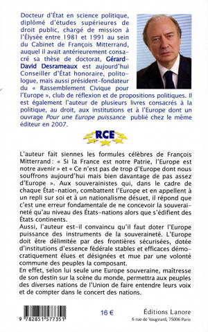 L'auteur fait siennes les formules célèbres de François Mitterrand : " Si la France est notre Patrie, l'Europe est notre avenir " et " Ce n'est pas de trop d'Europe dont nous souffrons aujourd'hui mais bien davantage de pas assez d'Europe ". Aux souverainistes qui, dans le cadre de chaque Etat-nation, combattent l'Europe et en appellent à un repli sur soi et à un nationalisme désuet, il répond que c'est une erreur fondamentale de ne concevoir la souveraineté qu'au niveau des Etats-nations alors que s'édifient des Etats continents. Aussi, l'auteur est-il convaincu qu'il faut doter l'Europe puissance des instruments de la souveraineté. L'Europe doit être délimitée par des frontières sécurisées, dotée d'institutions d'essence fédérale stables et efficaces démocratiquement élues et désignées et mue par une volonté commune des peuples la composant. En effet, selon lui seule une Europe souveraine, maîtresse de son destin sur la scène du monde, permettra aux peuples des diverses nations de l'Union de faire entendre leurs voix et de compter dans le concert des nations.