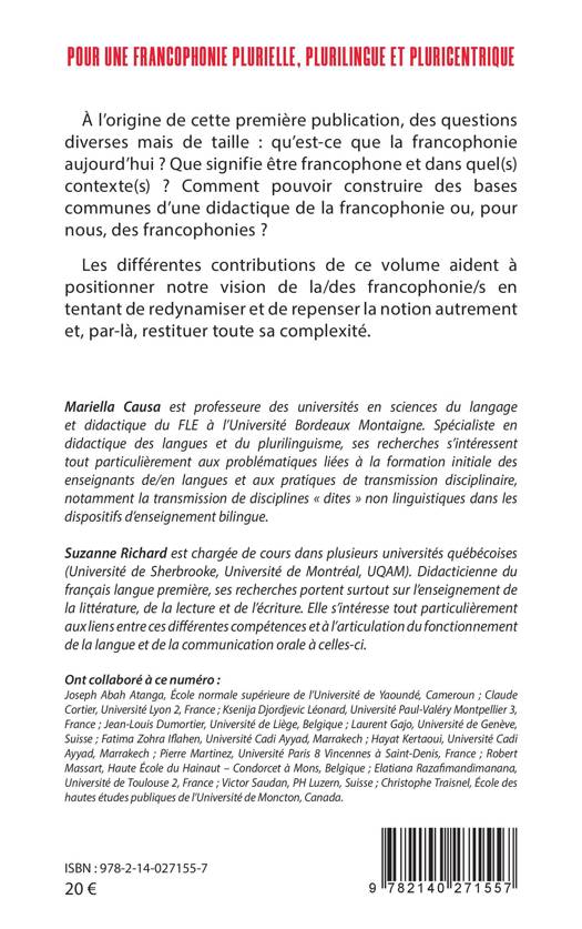 À l'origine de cette première publication, des questions diverses mais de taille: qu'est-ce que la francophonie aujourd'hui ? Que signifie être francophone et dans quel(s) contexte(s) ? Comment pouvoir construire des bases communes d'une didactique de la francophonie ou, pour nous, des francophonies ? Les différentes contributions de ce volume aident à positionner notre vision de la/des francophonie/s en tentant de redynamiser et de repenser la notion autrement et, par-là, restituer toute sa complexité.