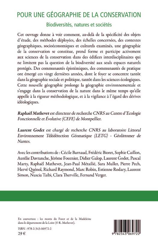 Cet ouvrage donne à voir comment une géographie de la conservation se constitue, prend forme et participe activement aux sciences de la conservation dans des édifices interdisciplinaires qui ne limitent pas la question de la biodiversité aux seuls espaces naturels protégés. Cette nouvelle géographie prolonge la géographie environnementale et s'engage dans la conservation de la nature dans le même temps qu'elle appelle à la rigueur méthodologique, et à la vigilance à l'égard des dérives idéologiques.