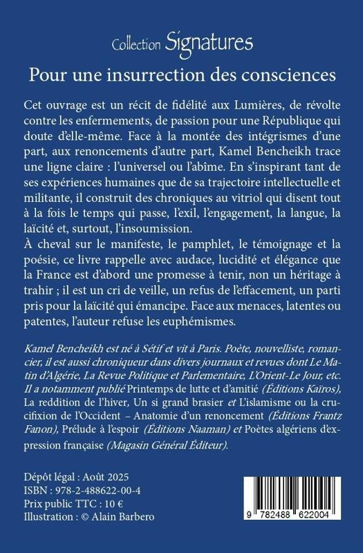 Ce manifeste est un récit de fidélité aux Lumières, de révolte contre les enfermements, de passion pour une République qui doute d’elle-même. Face à la montée des intégrismes d’une part, aux renoncements d’autre part, Kamel Bencheikh trace une ligne claire : l'universel ou l'abîme. En s’inspirant tant de ses expériences humaines que de sa trajectoire intellectuelle et militante, il construit des chroniques au vitriol qui disent tout à la fois le temps qui passe, l’exil, l’engagement, la langue, la laïcité et, surtout, l’insoumission. À cheval sur le manifeste, le pamphlet, le récit personnel et la poésie, ce livre rappelle avec audace, lucidité et élégance que la France est d'abord une promesse à tenir, non un héritage à trahir ; il est un cri de veille, un refus de l’effacement, un parti pris pour la laïcité qui émancipe. Face aux menaces, latentes ou patentes, l'auteur refuse les euphémismes.