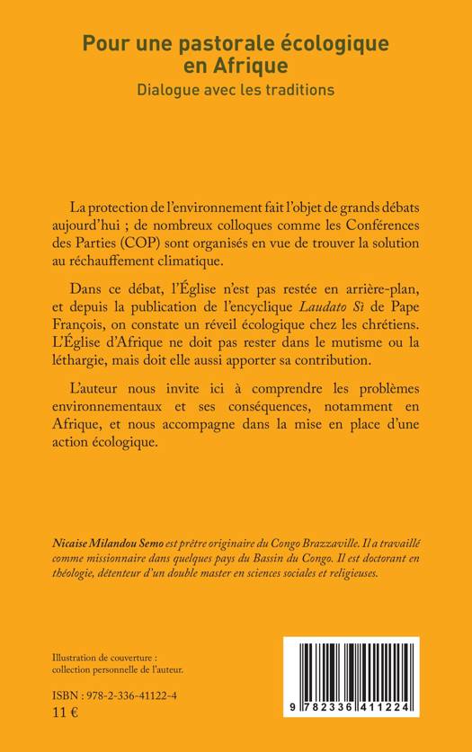 La protection de l'environnement fait l'objet de grands débats aujourd'hui; de nombreux colloques comme les Conférences des Parties (COP) sont organisés en vue de trouver la solution au réchauffement climatique. Dans ce débat, l'Église n'est pas restée en arrière-plan, et depuis la publication de l'encyclique Laudato Sì de Pape François, on constate un réveil écologique chez les chrétiens. L'Église d'Afrique ne doit pas rester dans le mutisme ou la léthargie, mais doit elle aussi apporter sa contribution. L'auteur nous invite ici à comprendre les problèmes environnementaux et ses conséquences, notamment en Afrique, et nous accompagne dans la mise en place d'une action écologique.