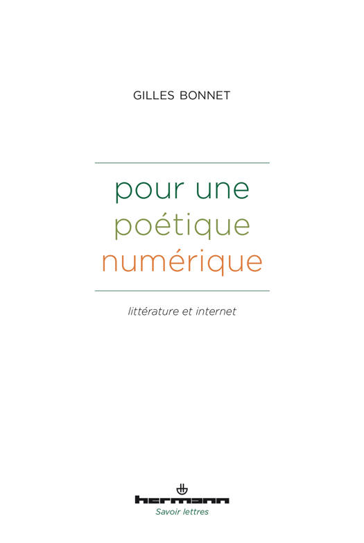 Poétique numérique, ou e-poétique : ce dernier terme surprendra peut-être, qui rappelle pourtant les avancées actuelles de l’escience, et plus largement des diverses herméneutiques de notre monde connecté. Cet essai aborde au continent neuf et immense déjà d’une littérature pensée et écrite par et pour le Web. Blogs et sites d’écrivains sont les foyers actifs de ces textes nativement numériques, qui font appel aux spécificités de la navigation sur Internet, mais également aux ressources proposées par l’image et le son, pour proposer de nouvelles expériences de production comme de réception de l’oeuvre. Il s’agit ici d’accueillir la diversité des pratiques contemporaines et de leurs supports, tout en expérimentant des outils d’analyse transversaux susceptibles d’en éclairer le sens et les enjeux. Loin d’une table rase, dangereusement séduisante dès qu’apparaît la fameuse « révolution numérique », ces pages prennent le parti de retravailler les acquis de la théorie littéraire afin d’inscrire dans le champ des humanités numériques l’étude de cette littérature vive.
