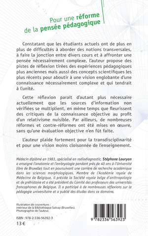 Constatant que les étudiants actuels ont de plus en plus de difficultés à aborder des notions transversales, à faire la jonction entre divers cours et à affronter une pensée nécessairement complexe, l'auteur propose des pistes de réflexion tirées des expériences pédagogiques plus anciennes mais aussi des concepts scientifiques les plus récents pour aboutir à une vision englobante d'une connaissance nécessairement complexe et qui tendrait à l'unité. Cette réflexion paraît d'autant plus nécessaire actuellement que les sources d'information non vérifiées se multiplient, en même temps que fleurissent des critiques de la connaissance objective au profit d'un relativisme nuisible. Par ailleurs, de nombreuses réformes et contre-réformes ont été mises en oeuvre sans qu'une évaluation objective n'en fût faite. L'auteur plaide fortement pour la transdisciplinarité et pour une vision moins cloisonnée de l'enseignement.