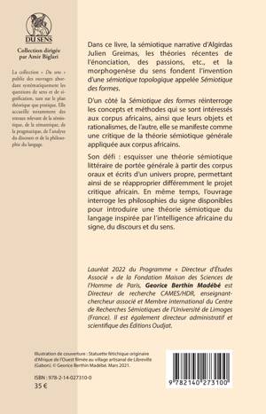 Dans ce livre, la sémiotique narrative d'Algirdas Julien Greimas, les théories récentes de l'énonciation, des passions, etc, et la morphogenèse du sens fondent l'invention d'une sémiotique topologique appelée Sémiotique des formes. D'un côté la Sémiotique des formes réinterroge les concepts et méthodes qui se sont intéressés aux corpus africains, ainsi que leurs objets et rationalismes, de l'autre, elle se manifeste comme une critique de la théorie sémiotique générale appliquée aux corpus africains. Son défi : esquisser une théorie sémiotique littéraire de portée générale à partir des corpus oraux et écrits d'un univers propre, permettant ainsi de se réapproprier différemment le projet critique africain. En même temps, l'ouvrage interroge les philosophies du signe disponibles pour introduire une théorie sémiotique du langage inspirée par l'intelligence africaine du signe, du discours et du sens.