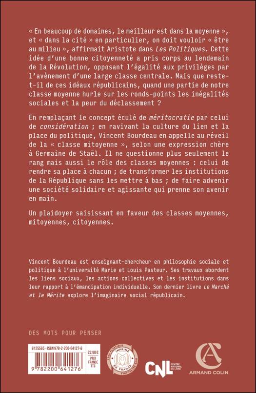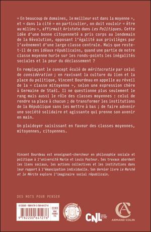 En remplaçant le concept éculé de méritocratie– qui institutionalise les injustices sociales – par celui de considération, l’auteur trouve un moyen de réveiller la république mitoyenne. Il ne questionne plus seulement le rang mais aussi le rôle des classes moyennes : celui de rendre sa place à chacun ; de transformer les institutions de la République sans les mettre à bas ; de faire advenir une société solidaire et agissante qui prenne son avenir en main.