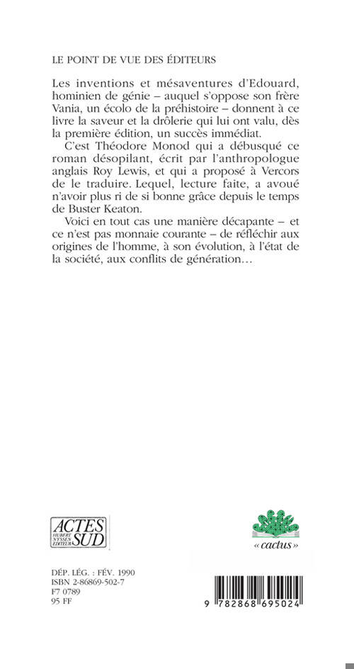 C'est Théodore Monod qui a débusqué ce roman désopilant, écrit par l'anthropologue anglais Roy Lewis, et qui a proposé à Vercors de le traduire. Lequel, lecture faite, a avoué n'avoir plus ri de si bonne grâce depuis le temps de Buster Keaton.