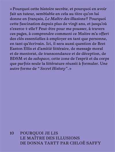 « Pourquoi cette histoire secrète, et pourquoi en avoir fait un tuteur, semblable en cela au titre qu’on lui donne en français, Le Maître des illusions ? Pourquoi cette fascination depuis plus de vingt ans, et jusqu’où s’exerce-t-elle ? Peut-être pour me pousser, à travers ces pages, à comprendre comment ce Maître m’a offert des clés essentielles à employer en tant que personne, en tant qu’écrivain.