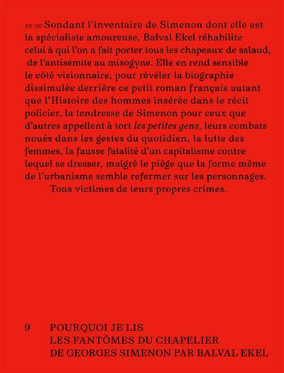 Sondant l’inventaire de Simenon dont elle est la spécialiste amoureuse, Balval Ekel réhabilite celui à qui l’on a fait porter tous les chapeaux de salaud, de l’antisémite au misogyne. Elle en rend sensible le côté visionnaire, pour révéler la biographie dissimulée derrière ce petit roman français autant que l’Histoire des hommes insérée dans le récit policier, la tendresse de Simenon pour ceux que d’autres appellent à tort les petites gens, leurs combats noués dans les gestes du quotidien, la lutte des femmes, la fausse fatalité d’un capitalisme contre lequel se dresser, malgré le piège que la forme même de l’urbanisme semble refermer sur les personnages. Tous victimes de leurs propres crimes.