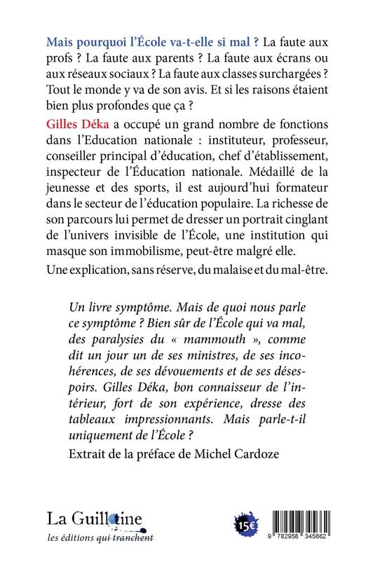 Gilles Déka a passé plus d’une quarantaine d’années au sein de l’Éducation nationale, en ayant exercé la quasi-totalité des fonctions d’enseignement et de direction. Dans ce livre, il donne des réponses pour comprendre la crise identitaire des métiers qui s’aggrave et la baisse du niveau des résultats scolaires. Cela dans un contexte où une plainte collective des personnels qui vivent avec un sentiment d’impuissance à réduire toutes les formes de fractures de notre société : scolaire, numérique ou sociale. Mais comment se fait-il que depuis les années 90, et cela malgré les réformes et les alternances politiques, rien ne semble déterminant pour faire advenir en profondeur de quelconques changements ou plus efficacement une vision stratégique ? En dépit de leurs discours et de leurs incantations, ce sont les acteurs-mêmes du système, qui paradoxalement, nourrissent l’immobilisme. Même l’éthique évolutive du métier n’y fait rien. Tout en dénonçant les moyens affectés, les personnels semblent comme se complaire collectivement dans cette posture. Involontairement, ils nourrissent le mécanisme de défiance croissant à l’égard du système éducatif. À l’inverse des acteurs de terrain, dit-on généralement, ce sont dans ce cas d’espèce les cadres supérieurs qui portent une lourde responsabilité, au regard de ce statu quo. Le propos de ce livre pose en effet l’hypothèse que cet immobilisme permanent s’autonourrit, et sert en fait les acteurs du système eux-mêmes, comme s’il s’agissait involontairement d’une sorte de carburant existentiel ! L’administration s’auto-administre et les professeurs sont dans la plainte ! L’auteur détaille les processus pour chaque catégorie, face à l’absence de stratégie éducative et pire face aux oubliés paradoxaux des discours, les élèves ! Une analyse des paradoxes de bon nombre d' acteurs de l’École qui conduisent en réalité toute l'institution à son immobilisme : des acteurs de premier plan mais dans l'ombre de l'impunité et que ces pages démasquent. Gilles Déka ose en révéler les comportements.
