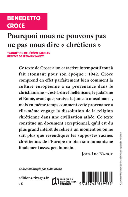 Ce texte de Croce a un caractère intempestif tout à fait étonnant pour son époque : 1942. Croce comprend en effet parfaitement bien comment la culture européenne a sa provenance dans le christianisme - c'est-à-dire l'héllénisme, le judaïsme et Rome, avant que paraisse le jumeau musulman - mais en même temps comment cette provenance a elle-même engagé la dissolution de la religion chrétienne dans une civilisation athée. Ce texte constitue un document exceptionnel, qu'il est du plus grand intérêt de relire à un moment où on ne sait plus que revendiquer les supposées racines chrétiennes de l'Europe ou bien son humanisme finalement assez peu humain. (Jean-Luc Nancy)