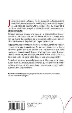 Pourquoi la connaissance du désastre nous laisse-t-elle si apathiques, si incapables de réagir et encore moins de nous révolter ? Cette absence de réaction pourrait-elle manifester notre obscur désir que cette catastrophe survienne ? Notre accord intime avec ce qui la produit ? Peut-on considérer que la destructivité environnementale serait inscrite non seulement au plus profond des dispositifs économiques, sociaux, administratifs et technologiques de nos sociétés, mais aussi au plus profond de nos inconscients ? L’auteur réfléchit, à partir de la psychanalyse, à notre lien à la nature et à l’environnement, à la trajectoire qui a conduit notre culture à un tel désastre, aux ressorts de notre attachement à cette culture et à ses modes de vie malgré la course suicidaire dans laquelle ils nous entraînent individuellement et collectivement, à notre incapacité à prendre véritablement acte de ce qui est advenu.