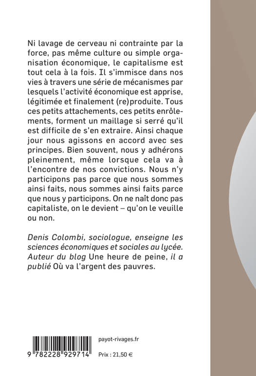 Ni lavage de cerveau ni contrainte par la force, pas même culture ou simple organisation économique, le capitalisme est tout cela à la fois. Il s'immisce dans nos vies à travers une série de mécanismes par lesquels l'activité économique est apprise, légitimée et finalement (re)produite. Tous ces petits attachements, ces petits enrôlements, forment un maillage si serré qu'il est difficile de s'en extraire. Ainsi chaque jour nous agissons en accord avec ses principes. Bien souvent, nous y adhérons pleinement, même lorsque cela va à l'encontre de nos convictions. Nous n'y participons pas parce que nous sommes ainsi faits, nous sommes ainsi faits parce que nous y participons. On ne naît donc pas capitaliste, on le devient - qu'on le veuille ou non.
