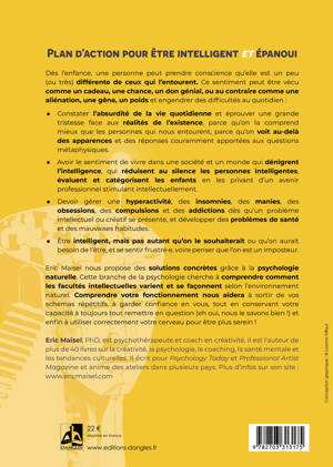 Dès l’enfance, une personne peut prendre conscience qu’elle est un peu (ou très) différente de ceux qui l’entourent. Ce sentiment peut être vécu comme un cadeau, une chance, un don génial, ou au contraire comme une aliénation, une gêne, un poids et engendrer des difficultés au quotidien : Constater l’absurdité de la vie quotidienne et éprouver une grande tristesse face aux réalités de l’existence, parce qu’on la comprend mieux que les personnes qui nous entourent, parce qu’on voit au-delà des apparences et des réponses couramment apportées aux questions métaphysiques. Avoir le sentiment de vivre dans une société et un monde qui dénigrent l’intelligence, et qui réduisent au silence les personnes intelligentes. Devoir gérer une hyperactivité, des insomnies, des manies, des obsessions, des compulsions et des addictions dès qu’un problème intellectuel ou créatif se présente, et développer des problèmes de santé et des mauvaises habitudes, etc. Eric Maisel nous propose des solutions concrètes grâce à la psychologie naturelle. Cette branche de la psychologie cherche à comprendre comment les facultés intellectuelles varient et se façonnent selon l’environnement naturel.