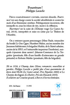 ièce complètement cintrée, souvent absurde, Pourriture ! est une charge contre la société ultralibérale et contre les excès d’un féminisme extrême. Politiquement incorrecte, elle interpelle et, sous les éclats de rire, incite à la réflexion. Pourriture ! est la suite de L’Écharpe rouge (Le Castor Astral, 2014), interprétée et mise en scène par Le Théâtre de l’Alambic.