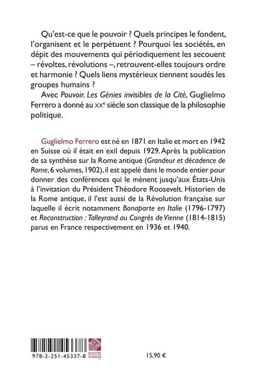 Qu'est-ce que le pouvoir ? Quels principes le fondent, l'organisent et le perpetuent ? Pourquoi les societes, en depit des mouvements qui periodiquement les secouent - revoltes, revolutions -, retrouvent-elles toujours ordre et harmonie ? Quels liens mysterieux tiennent soudes les groupes humains ? Avec Pouvoir. Les Genies invisibles de la Cite, Guglielmo Ferrero a donne au XXe siecle son classique de la philosophie politique.