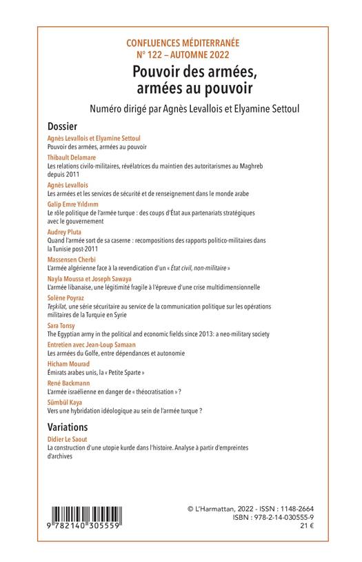 CONFLUENCES MÉDITERRANÉE N° 122 AUTOMNE 2022 Pouvoir des armées, armées au pouvoir Numéro dirigé par Agnès Levallois et Elyamine Settoul Dossier Agnès Levallois et Elyamine Settoul Pouvoir des armées, armées au pouvoir Thibault Delamare Les relations civilo-militaires, révélatrices du maintien des autoritarismes au Maghreb depuis 2011 Agnès Levallois Les armées et les services de sécurité et de renseignement dans le monde arabe Galip Emre Y ld r m Le rôle politique de l'armée turque : des coups d'État aux partenariats stratégiques avec le gouvernement Audrey Pluta Quand l'armée sort de sa caserne : recompositions des rapports politico-militaires dans la Tunisie post-2011 Massensen Cherbi L'armée algérienne face à la revendication d'un « État civil, non-militaire » Nayla Moussa et Joseph Sawaya L'armée libanaise, une légitimité fragile à l'épreuve d'une crise multidimensionnelle Solène Poyraz Te kilat, une série sécuritaire au service de la communication politique sur les opérations militaires de la Turquie en Syrie Sara Tonsy The Egyptian army in the political and economic fields since 2013: a neo-military society Entretien avec Jean-Loup Samaan Les armées du Golfe, entre dépendances et autonomie Hicham Mourad Émirats arabes unis, la « Petite Sparte » René Backmann L'armée israélienne en danger de « théocratisation » ? Sümbül Kaya Vers une hybridation idéologique au sein de l'armée turque ? Variations Didier Le Saout La construction d'une utopie kurde dans l'histoire. Analyse à partir d'empreintes d'archives