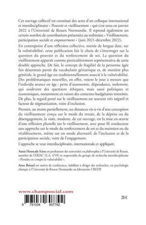 Cet ouvrage collectif est constitué des actes d’un colloque international et interdisciplinaire « Pouvoir et vieillissement » qui s’est tenu en janvier 2022 à l’Université de Rouen Normandie. Il reprend également un certain nombre de contributions présentées au webinaire « Vieillissement, participation sociale et empowerment » (juin 2021-décembre 2022). L’objectif de cette publication est essentiellement de s’interroger sur la vulnérabilité et donc sur la question du pouvoir et du renforcement de soi. La question du vieillissement apparaît comme particulièrement représentative de cette double approche. De fait, le concept de fragilité de la personne âgée fait désormais partie du vocabulaire gériatrique et, de manière plus générale, le grand âge est traditionnellement associé à la vulnérabilité. Des problématiques nouvelles, en effet, voient le jour à mesure que l’individu avance en âge : perte d’autonomie, dépendance isolement, qui soulèvent des questions éthiques, mais aussi politiques et économiques, notamment en raison des contextes budgétaires restreints. De plus, le regard porté sur le vieillissement est souvent très négatif et facteur de stigmatisation, voire d’exclusion. Prenant, au moins partiellement, ses distances vis-à-vis d’une conception du vieillissement conçu sur le mode du retrait, de la déprise ou du désengagement, la visée, modeste, de cet ouvrage, est la mise en oeuvre d’une réflexion plurielle sur le vieillissement, avec pour fil conducteur une approche sur le mode du renforcement de soi et du maintien ou du rétablissement, même sur un mode alternatif, de l’inclusion et de la participation sociale, voire de l’engagement. L’approche se veut interdisciplinaire, internationale et appliquée.