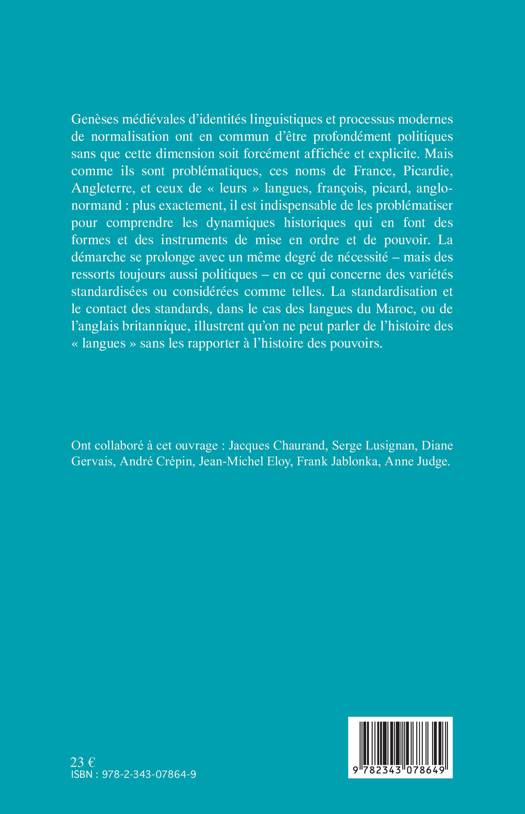 Genèses médiévales d'identités linguistiques et processus modernes de normalisation ont en commun d'être profondément politiques sans que cette dimension soit forcément affichée et explicite. Mais comme ils sont problématiques, ces noms de France, Picardie, Angleterre, et ceux de "leurs" langues, françois, picard, anglo-normand : plus exactement, il est indispensable de les problématiser pour comprendre les dynamiques historiques qui en font des formes et des instruments de mise en ordre et de pouvoir.