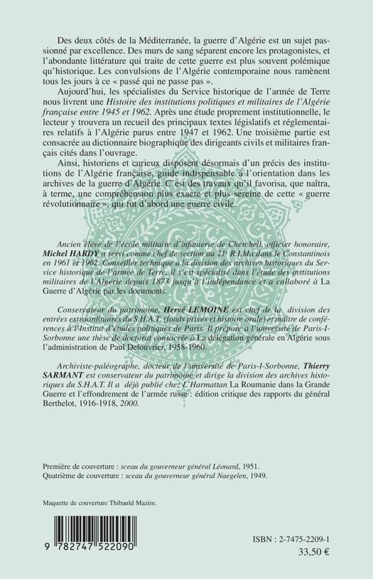 Les spécialistes du Service Historique de l'armée de Terre nous livrent une Histoire des institutions politiques et militaires de l'Algérie française entre 1945 et 1962. Après une étude proprement institutionnelle, le lecteur y trouvera un recueil des principaux textes législatifs et réglementaires relatifs à l'Algérie parus entre 1947 et 1962. Une troisième partie est consacrée au dictionnaire biographique des dirigeants civils et militaires français cités dans l'ouvrage.