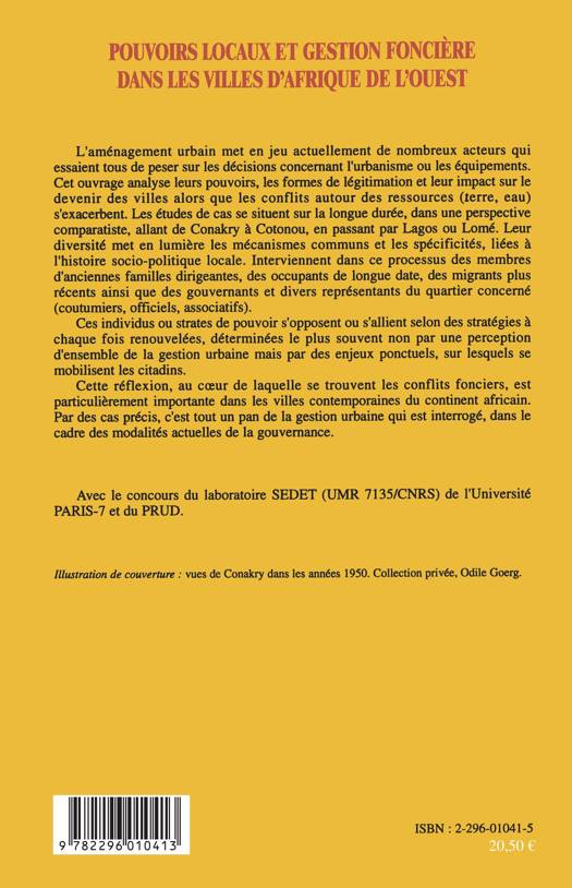 L'aménagement urbain met en jeu de nombreux acteurs. Cet ouvrage analyse leurs pouvoirs, les formes de légitimation et leur impact sur le devenir des villes alors que les conflits autour des ressources s'exacerbent. Allant de Conakry à Cotonou, en passant par Lagos ou Lomé, la diversité des cas met en lumière les mécanismes communs et les spécificités, liées à l'histoire socio-politique locale.