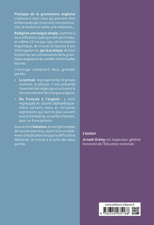 L’ouvrage Pratique de la grammaire anglaise s’adresse à tous ceux souhaitant une aide à l’apprentissage de l’anglais, leur permet de trouverla réponse à leur interrogation et, par la pratique, de faire le point sur les connaissances de la grammaire anglaise et de combler d’éventuelles lacunes.