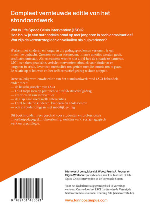 Werken met kinderen en jongeren die gedragsproblemen vertonen, is een moeilijke opdracht. Grenzen worden overtreden, intense emoties worden geuit, conflicten ontstaan. Als volwassene weet je niet altijd hoe de situatie te hanteren. LSCI, een therapeutische, verbale interventiemethodiek voor kinderen en jongeren in crisis, levert een methodiek om gericht met die emotie om te gaan, de relatie op te bouwen en het zelfdestructief gedrag te doen stoppen.