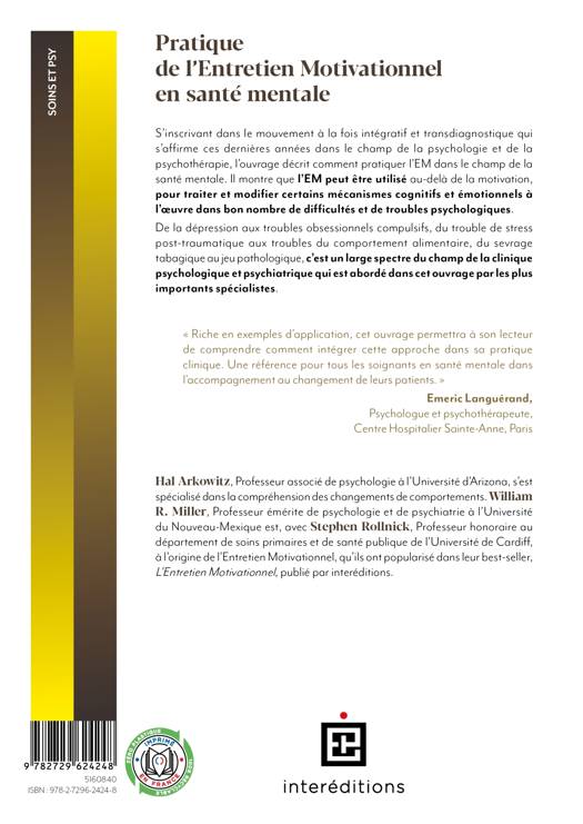 Cet ouvrage collectif montre comment utiliser l’entretien motivationnel (EM), dans le champ de la psychothérapie. Il réunit des experts reconnus explicitant son utilisation pour des troubles tels que la dépression, l’anxiété, les conduites suicidaires, les TOC, les problèmes d’addictions, de schizophrénie, etc. L’EM étant un outil d’engagement de la personne dans le changement, l’ouvrage inclut un chapitre sur son usage en milieu judiciaire.