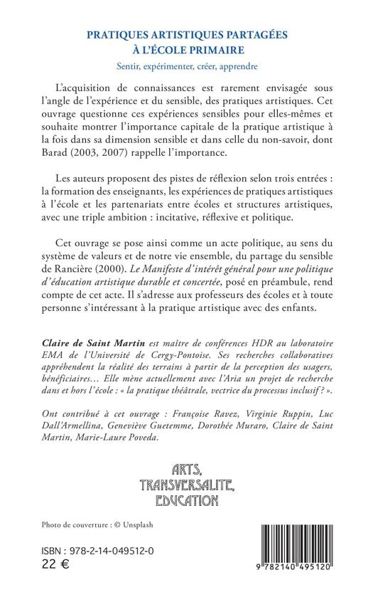 L'acquisition de connaissances est rarement envisagée sous l'angle de l'expérience et du sensible, des pratiques artistiques. Cet ouvrage questionne ces expériences sensibles pour elles-mêmes et souhaite montrer l'importance capitale de la pratique artistique à la fois dans sa dimension sensible et dans celle du non-savoir, dont Barad (2003, 2007) rappelle l'importance. Les auteurs proposent des pistes de réflexion selon trois entrées: la formation des enseignants, les expériences de pratiques artistiques à l'école et les partenariats entre écoles et structures artistiques, avec une triple ambition: incitative, réflexive et politique. Cet ouvrage se pose ainsi comme un acte politique, au sens du système de valeurs et de notre vie ensemble, du partage du sensible de Rancière (2000). Le Manifeste d'intérêt général pour une politique d'éducation artistique durable et concertée, posé en préambule, rend compte de cet acte. Il s'adresse aux professeurs des écoles et à toute personne s'intéressant à la pratique artistique avec des enfants.