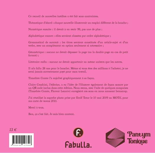 Ce recueil de nouvelles inédites a été fait sous contraintes.Thématique d’abord : chaque nouvelle illustrerait un emploi différent de la bouche ;Numérique ensuite : il devait y en avoir 99, pas une de plus ;Alphabétique encore : elles seraient classées par ordre alphabétique ;Grammatical de surcroît : les titres seraient constitués d’un article-sujet et d’un verbe, avec un complément en option seulement si nécessaire ;Géométrique : aucune ne devait dépasser la page (ou la double page en cas de petit format) ;Littéraire enfin : aucune ne devait appartenir au même univers que les autres.Il m’a fallu 28 ans pour le boucler. Même si vous êtes des millions à l’acheter, je ne serai jamais correctement payé pour mon travail.