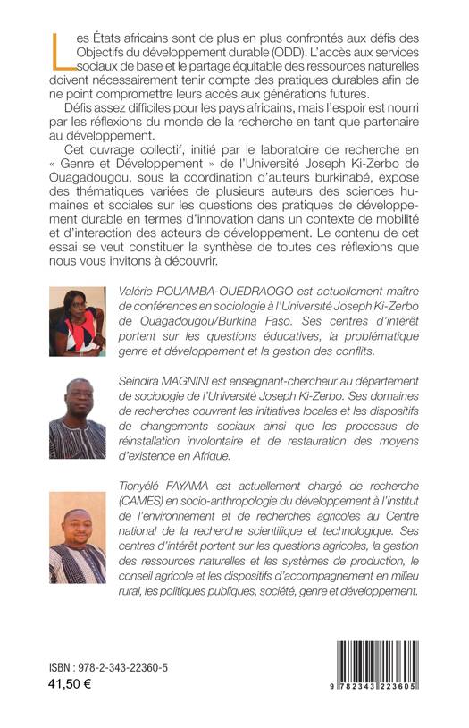 Les États africains sont de plus en plus confrontés aux défis des Objectifs du développement durable (ODD). L’accès aux services sociaux de base et le partage équitable des ressources naturelles doivent nécessairement tenir compte des pratiques durables afin de ne point compromettre leurs accès aux générations futures. Défis assez difficiles pour les pays africains, mais l’espoir est nourri par les réflexions du monde de la recherche en tant que partenaire au développement. Cet ouvrage collectif expose des thématiques variées de plusieurs auteurs des sciences humaines et sociales sur les questions des pratiques de développement durable en termes d’innovation dans un contexte de mobilité et d’interaction des acteurs de développement.