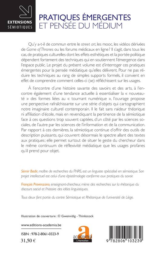 Qu'y a-t-il de commun entre le street art, les mooc ou les forums médicaux en ligne ? Il s'agit, dans tous les cas, de pratiques culturelles qui dépendent fortement des techniques qui en soutiennent l'émergence dans l'espace public. Le projet du présent volume est d'interroger ces pratiques émergentes pour la pensée médiatique qu'elles délivrent. La perspective d'analyse est sémiotique et se décline à travers une série d'études de cas qui cartographient notre imaginaire culturel contemporain.
