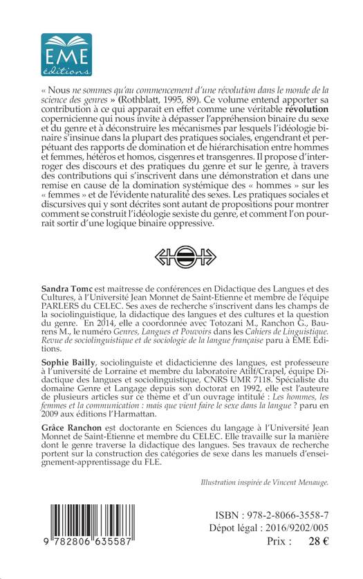 « Nous ne sommes qu'au commencement d'une révolution dans le monde de la science des genres » (Rothblatt, 1995, 89). Ce volume entend apporter sa contribution à ce qui apparait en effet comme une véritable révolution copernicienne qui nous invite à dépasser l'appréhension binaire du sexe et du genre et à déconstruire les mécanismes par lesquels l'idéologie binaire s'insinue...