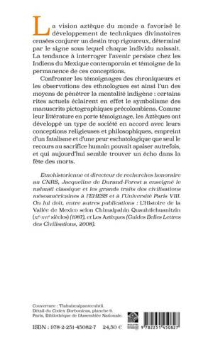 La vision azteque du monde a favorise le developpement de techniques divinatoires censees conjurer un destin trop rigoureux, determine par le signe sous lequel chaque individu naissait. La tendance a interroger l'avenir persiste chez les Indiens du Mexique contemporain et temoigne de la permanence de ces conceptions. Confronter les temoignages des chroniqueurs et les observations des ethnologues est ainsi l'un des moyens de penetrer la mentalite indigene: certains rites actuels eclairent en effet le symbolisme des manuscrits pictographiques precolombiens. Comme leur litterature en porte temoignage, les Azteques ont developpe un type de societe en accord avec leurs conceptions religieuses et philosophiques, empreint d'un fatalisme et d'une peur eschatologique que seul le recours au sacrifice humain pouvait apaiser autrefois, et qui aujourd'hui semble trouver un echo dans la fete des morts.