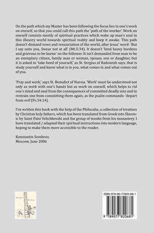 I’ve written this work about ascetic practices on request of my Master to give the interested people yet another view on the essence of the spiritual Path. Namely, how man can come closer to God and let Him ‘bring man up also out of an horrible pit, out of the miry clay’, and put a new song in man’s mouth. (Ps. 40:2,3). Man can come closer to God through work on himself, that is working on purifying his heart and soul, his inner world, making through this work still more room available for Him. On the path which my Master has been following the focus lies in one’s work on oneself, so that you could call this path the ‘path of the worker’. Work on oneself consists mostly of spiritual practices which wake up man’s soul in this illusory world towards spiritual reality and keep it awake. This path doesn’t demand vows and renunciation of the world, after Jesus’ word: ‘But I say unto you, Swear not at all’ (Mt.5:34). It doesn’t ‘bind heavy burdens and grievous to be borne’ on the follower. It isn’t demanded from man to be an exemplary citizen, family man or woman, spouse, son or daughter, but it is asked to ‘take heed of yourself,’ as St. Sergius of Radonezh says, that is study yourself and know what is in you, what comes in and what comes out of you. ‘Pray and work,’ says St. Benedict of Nursia. ‘Work’ must be understood not only as work with one’s hands but as work on oneself, which helps to rid one’s mind and soul from the consequences of committed deadly sins and to restrain one from committing them again, as the psalm commands: ‘depart from evil’(Ps.34:14). I’ve written this book with the help of the Philocalia, a collection of treatises by Christian holy fathers, which has been translated from Greek into Slavonic by Saint Paisi Velichkovski and the group of monks from his monastery. I have translated / adapted their spiritual instructions into modern language, hoping to make them more accessible to the reader. Konstantin Serebrov, Moscow, June 2006
